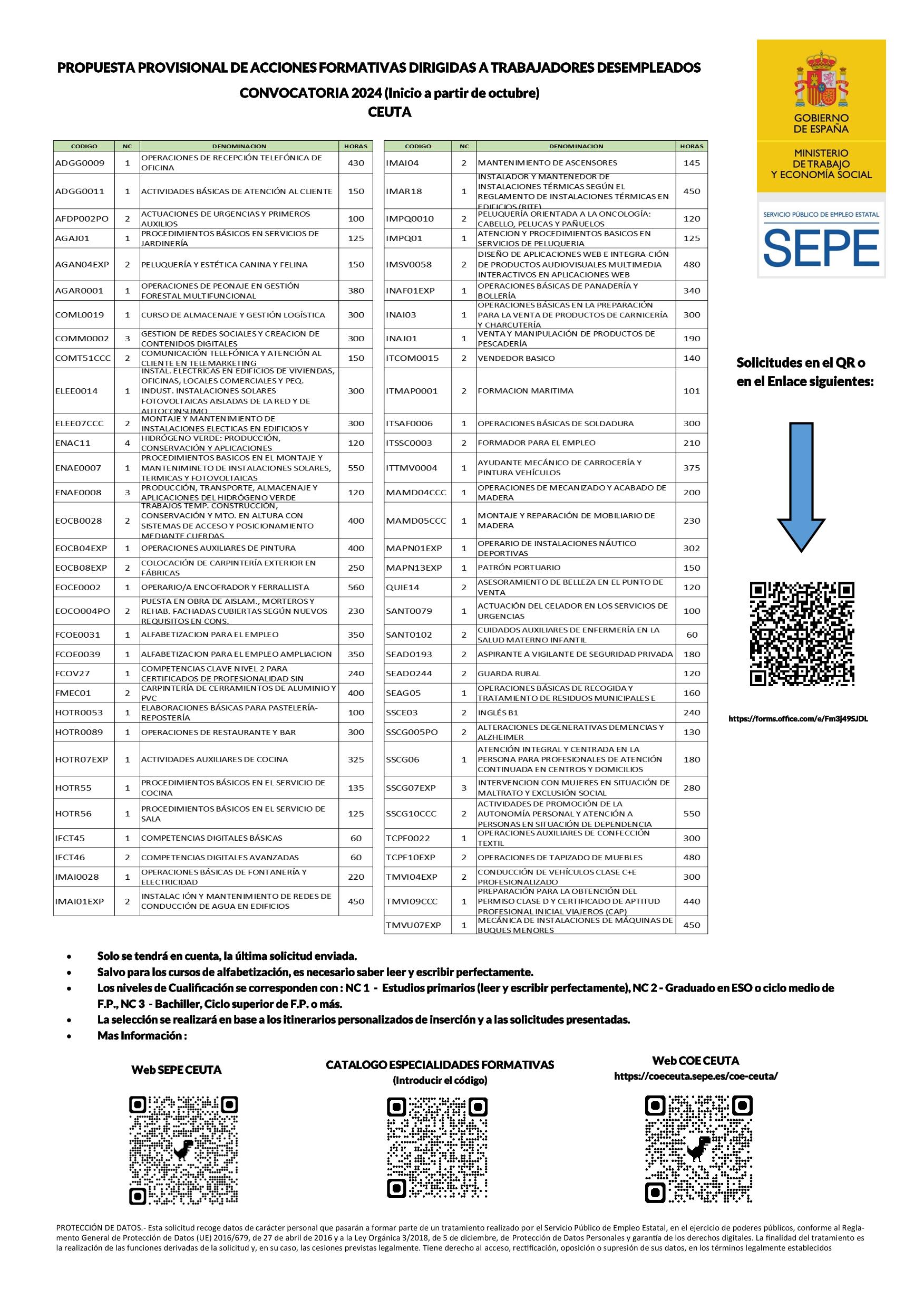 En los próximos días, esta prevista la publicación de la Convocatoria de formación para el empleo dirigida a trabajadores desempleados de Ceuta. La Dirección Provincial del SEPE, anticipa la oferta formativa que se propondrá, al objeto de ir recabando información respecto a las preferencias de los demandantes de empleo, que, junto con las necesidades de formación detectadas, por los técnicos de los Servicios de Orientación, servirá para completar la selección de participantes en las acciones formativas que resulten asignadas.